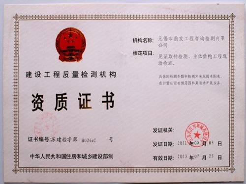 近日,從江蘇省住房和城鄉(xiāng)建設(shè)廳行政審批公告(蘇建審批公告(2011)第0154號(hào)文獲悉),無錫市前友工程咨詢檢測有限公司已順利通過建設(shè)工程檢測機(jī)構(gòu)資質(zhì)審查,核準(zhǔn)資質(zhì)的項(xiàng)目和類別包括:見證取樣檢測A、主體結(jié)構(gòu)工程現(xiàn)場專項(xiàng)檢測C、建筑節(jié)能工程專項(xiàng)檢測(備1)、室內(nèi)環(huán)境備案類檢測(備3)、建筑水電備案類檢測(備6-1)、墻體材料備案檢測(備7)、飾面材料備案類檢測(備8)、防水材料備案類檢測(備9)、門窗備案類檢測(備10)。![]() | ||