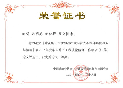 由中國建筑業(yè)協(xié)會主辦,江蘇省建設(shè)工程質(zhì)量監(jiān)督總站承辦的2015年度華東片區(qū)工程質(zhì)量監(jiān)督工作年會,于11月19日~20日在蘇州成功舉行。會前,組織了工程質(zhì)量監(jiān)督管理論文征集評審活動,會上頒發(fā)了優(yōu)秀論文獎。由無錫前友咨詢檢測公司撰寫的“建筑施工承插型盤扣式鋼管支架構(gòu)件強(qiáng)度試驗(yàn)與檢驗(yàn)”獲優(yōu)秀論文二等獎,并入選《工程質(zhì)量》雜志。 建筑施工承插型盤扣式鋼管支架近十年的開發(fā)應(yīng)用,已成為一種新型模架體系,應(yīng)用于建筑工程和市政工程中。產(chǎn)學(xué)研團(tuán)隊(duì)先后對盤扣支架整架性能、節(jié)點(diǎn)構(gòu)件和構(gòu)配件進(jìn)行了大量系統(tǒng)實(shí)驗(yàn)和檢測,旨在科研的基礎(chǔ)上,分列了出廠檢驗(yàn)、型式檢驗(yàn)和見證取樣檢測相關(guān)要求,為產(chǎn)品出廠檢驗(yàn)和工程現(xiàn)場驗(yàn)收確定檢驗(yàn)項(xiàng)目和判定依據(jù),為建筑施工安全提供技術(shù)保證,并為制訂工程行業(yè)標(biāo)準(zhǔn)和產(chǎn)品行業(yè)標(biāo)準(zhǔn)提供了技術(shù)依據(jù)。 經(jīng)過由無錫速捷腳手架公司、東南大學(xué)、無錫市前友咨詢檢測公司等單位組成的產(chǎn)學(xué)研團(tuán)隊(duì)歷經(jīng)近十年的不斷深入的研發(fā)創(chuàng)新和全國大量建筑、路橋、軌道交通等重點(diǎn)工程成功應(yīng)用,承插型盤扣式鋼管支架產(chǎn)品品質(zhì)和應(yīng)用技術(shù)已趨成熟,其支架具有的施工安全可靠度高、承載力大、施工工期短、現(xiàn)場文明美觀等優(yōu)點(diǎn)已被行業(yè)所認(rèn)同,并成為高大結(jié)構(gòu)支模的首選。承插型盤扣式鋼管支架構(gòu)件已列入住建部建筑業(yè)10項(xiàng)新技術(shù)。中華人民共和國行業(yè)標(biāo)準(zhǔn)《建筑施工承插型盤扣式鋼管支架安全技術(shù)規(guī)程》(JGJ231-2010)已由國家住建部于2010年11月17日發(fā)布,2011年10月1日起實(shí)施??梢姡摷夹g(shù)在推廣應(yīng)用時已有相應(yīng)標(biāo)準(zhǔn)要求可參照。并且,相關(guān)產(chǎn)品的行業(yè)標(biāo)準(zhǔn)《承插型盤扣式鋼管支架構(gòu)件》也已完成送審稿。 為助推新型腳手架技術(shù)的推廣應(yīng)用,確保安全施工,無錫市前友咨詢檢測公司積極創(chuàng)造條件,取得了鋼管扣件、承插型盤扣式鋼管支架第三方見證取樣檢測的資質(zhì),并已在無錫市建設(shè)工程安全監(jiān)督站備案。