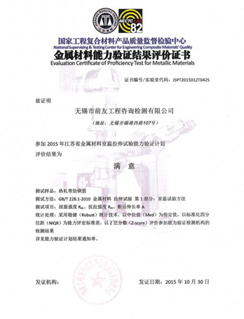 為加強(qiáng)全省檢測機(jī)構(gòu)的監(jiān)督管理,全面提高檢測機(jī)構(gòu)金屬材料室溫拉伸檢測的整體水平,根據(jù)省質(zhì)量技術(shù)監(jiān)督局蘇質(zhì)監(jiān)認(rèn)函[2015]12號文的要求,國家工程復(fù)合材料產(chǎn)品質(zhì)量監(jiān)督檢驗(yàn)中心作為技術(shù)支持單位,于2015年5月~10月在全省范圍內(nèi)實(shí)施了金屬材料室溫拉伸試驗(yàn)?zāi)芰︱?yàn)證活動。 元月22日,在南京召開了江蘇省金屬材料室溫拉伸能力驗(yàn)證結(jié)果通報會暨檢測技術(shù)交流會,會議內(nèi)容有:實(shí)驗(yàn)室資質(zhì)認(rèn)定要求及評審準(zhǔn)則解讀;2015年全省金屬材料室溫拉伸試驗(yàn)?zāi)芰︱?yàn)證結(jié)果通報;金屬材料室溫拉伸試驗(yàn)關(guān)鍵因素解析與試驗(yàn)控制;實(shí)驗(yàn)室認(rèn)可與能力驗(yàn)證;發(fā)放能力驗(yàn)證結(jié)果報告和證書。 公司派代表參加了會議,領(lǐng)取了金屬材料能力驗(yàn)證結(jié)果評價證書,評價結(jié)果為滿意。
