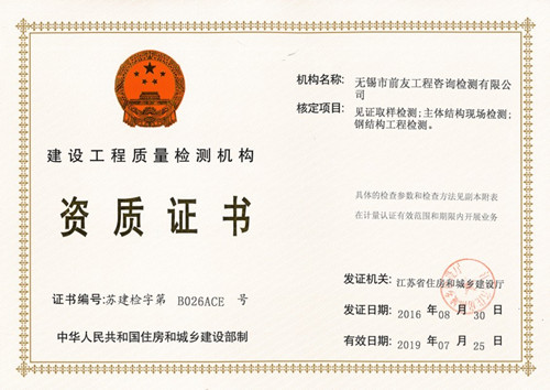 近日,無錫市前友工程咨詢檢測有限公司從江蘇省住房和城鄉(xiāng)建設(shè)廳行政服務(wù)中心領(lǐng)回了嶄新的《建設(shè)工程質(zhì)量檢測機(jī)構(gòu)資質(zhì)證書》和《江蘇省建設(shè)工程質(zhì)量檢測機(jī)構(gòu)備案證書》。據(jù)此,公司資質(zhì)延續(xù)工作已率先順利完成。 自2006年成立以來,公司在各級主管部門的領(lǐng)導(dǎo)和關(guān)心下,在廣大客戶的支持和配合下,在全體職工的不懈努力下,檢測能力逐步提高,至今,已具備了以下檢測資質(zhì)能力項(xiàng)目: 見證取樣類:水泥物理力學(xué)性能;鋼筋(焊接連接)力學(xué)性能;砂、石常規(guī);混凝土、砂漿強(qiáng)度;簡易土工;混凝土摻加劑(外加劑、粉煤灰);瀝青、瀝青混合料;預(yù)應(yīng)力鋼絞線、錨夾具、金屬螺紋管。 專項(xiàng)檢測類:主體結(jié)構(gòu)工程現(xiàn)場檢測(包括鋼筋保護(hù)層、現(xiàn)場強(qiáng)度檢測、結(jié)構(gòu)性能、后置埋件力學(xué)檢測);鋼結(jié)構(gòu)工程檢測(包括鋼結(jié)構(gòu)工程用鋼材、連接件、鋼結(jié)構(gòu)焊縫質(zhì)量、防腐防火涂層、鋼結(jié)構(gòu)變形);建筑節(jié)能檢測(建筑節(jié)能材料檢測、建筑節(jié)能現(xiàn)場檢測和熱工性能現(xiàn)場檢測)。 備案檢測類:室內(nèi)環(huán)境檢測、建筑水電檢測、墻體、屋面材料、飾面材料、防水材料、門窗檢測。 安全檢測類:鋼管、扣件、承插型盤扣式鋼管支架檢測。 測繪類:工程測量、不動產(chǎn)測繪。 其它類:相零線檢測、 截面尺寸檢測(現(xiàn)澆樓板厚度檢測)、室內(nèi)空間尺寸檢測、輕鋼龍骨、石膏板、鋁塑復(fù)合板檢測。