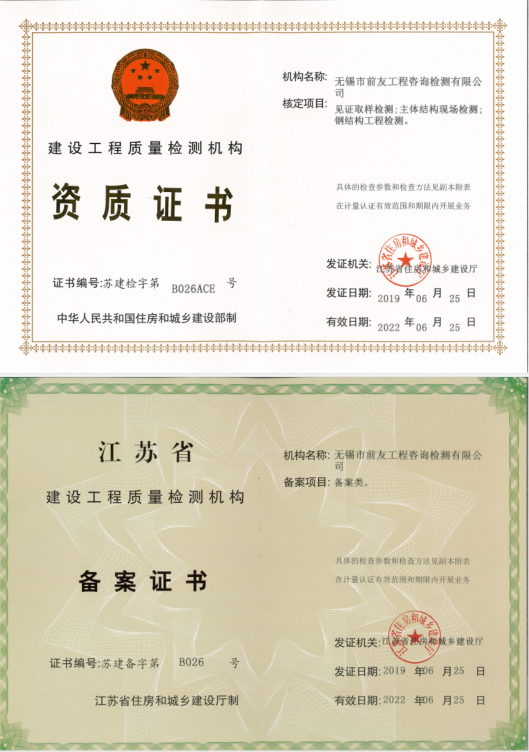 近日,無錫市前友工程咨詢檢測有限公司從江蘇省政務(wù)服務(wù)中心住房城鄉(xiāng)建設(shè)分中心領(lǐng)回了嶄新的《建設(shè)工程質(zhì)量檢測機構(gòu)資質(zhì)證書》。據(jù)此,公司資質(zhì)延續(xù)工作已率先順利完成。 十多年來,公司經(jīng)過多輪增項擴項,檢測能力不斷提高,已覆蓋建設(shè)工程見證取樣類、專項檢測類、備案檢測類、測繪類、安全檢測類和其他類。同時,已入圍江蘇省裝配式建筑檢測機構(gòu)名錄和無錫市房屋安全鑒定檢測機構(gòu)名錄。 檢測資質(zhì)的順利延續(xù),為公司品質(zhì)發(fā)展奠定了堅實的基礎(chǔ)。公司將虔誠為政府、客戶和社會提供更優(yōu)質(zhì)、更全面的咨詢檢測服務(wù)。