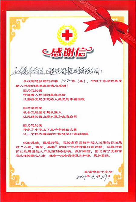 為進(jìn)一步踐行社會(huì)主義核心價(jià)值觀,大力弘揚(yáng)“人道、博愛、奉獻(xiàn)”的紅十字精神,倡導(dǎo)“互助、環(huán)保、節(jié)能、公益”的社會(huì)理念,根據(jù)市委市級(jí)機(jī)關(guān)工委、市文明辦、市紅十字會(huì)《紅十字愛心衣物捐贈(zèng)倡議書》精神,我公司積極組織,大家踴躍捐出款式新、質(zhì)量好的衣物并主動(dòng)利用節(jié)假日期間對(duì)所捐衣物進(jìn)行清洗、晾曬、消毒,確保捐贈(zèng)的愛心衣物符合要求,并于2021年1月29日下午將所捐衣物送至無(wú)錫市紅十字會(huì)。